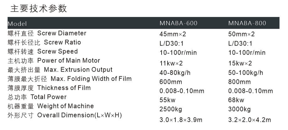 特殊設(shè)計(jì)的螺桿產(chǎn)量高,塑化好。適用于吹制低密度聚乙烯(LDPE)高密度聚乙烯(HDPE)線性低密度聚乙烯(LLDPE)等塑料薄膜,廣泛應(yīng)用于食品、服裝、