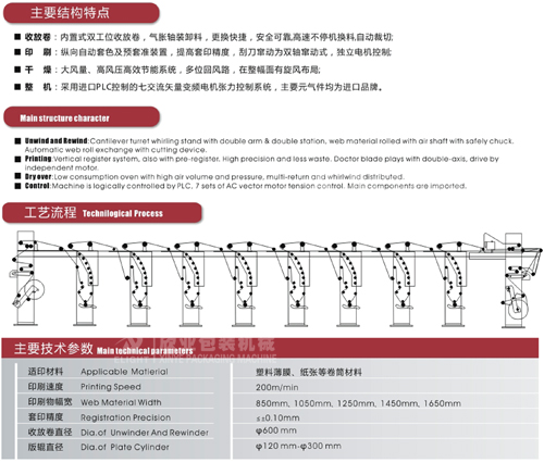 該機(jī)適合印刷聚乙烯、聚丙烯塑料袋、玻璃紙、卷筒紙等包裝材料,是食品紙包裝,超市手提袋、馬夾袋、服裝袋等包裝的理想印刷設(shè)備。