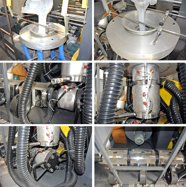 本機(jī)組擠出機(jī),機(jī)筒、螺桿均采用優(yōu)質(zhì)合金鋼,經(jīng)氮化處理和精密加工,具有較高的硬度和耐腐蝕性,特殊設(shè)計(jì)的螺桿產(chǎn)量高,塑化好。適用于吹制低密度聚乙烯(HDPE)線(xiàn)性低密度聚乙烯(LLDPE) 等塑料薄膜,廣泛應(yīng)用于食品、服裝、垃圾袋、背心袋等民用及工業(yè)包裝。