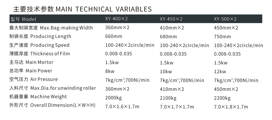 本機以HDPE、LDPE筒膜為原料可生產(chǎn)印刷、本色、背心袋,采用PLC控制(步進)自動定長、液晶觸摸屏實時顯示,從送料、封底、切斷、沖口輸送一次性完成,自動化程度高,經(jīng)濟效益好。