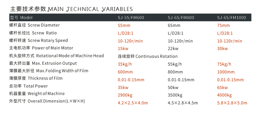 本機(jī)組擠出機(jī),機(jī)筒、螺桿均采用優(yōu)質(zhì)合金鋼,經(jīng)氮化處理和精密加工,具有較高的硬度和耐腐蝕性,特殊設(shè)計(jì)的螺桿產(chǎn)量高,塑化好。適用于吹制低密度聚乙烯(HDPE)線性低密度聚乙烯(LLDPE) 等塑料薄膜,廣泛應(yīng)用于食品、服裝、垃圾袋、背心袋等民用及工業(yè)包裝。