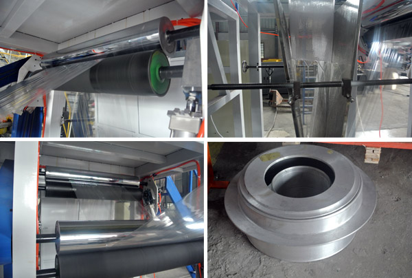 根椐工藝要求將擠出機(jī)抬高至 3米, 吹膜方式: 下吹法。卷取裝置采用力矩電機(jī),可保持適宜的張力,收卷整齊,換卷方便。