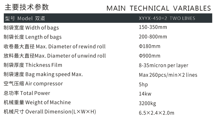 本機(jī)由三種型號(hào)主要生產(chǎn)可裝食品的PE(LDPE)(HDPE)半弧形袋及其他用途的PVC熱收縮膜袋。采用步進(jìn)電機(jī),配合操作簡(jiǎn)單的微電腦,數(shù)值控制器,以數(shù)字按鍵,能在數(shù)秒鐘內(nèi)變換各種長(zhǎng)度,節(jié)省人力物力。毛邊廢料自動(dòng)脫離切掉, 成品一次完成,確保品質(zhì)穩(wěn)定,提高競(jìng)爭(zhēng)力??梢园状p排作業(yè)。成品整疊收集輸送裝置。標(biāo)志光電眼,控制印刷袋。